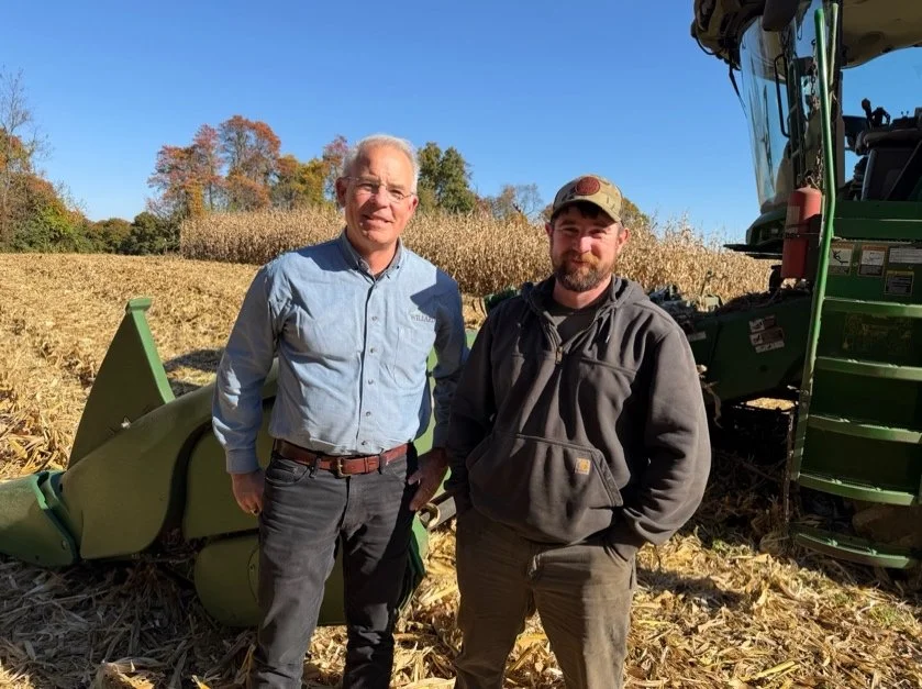 Joshua Towson (right) takes a quick break from harvest to talk ROI with Mike Twining (left) of Willard Agri-Service.